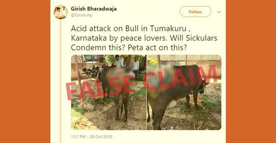 एक ट्विटर यूजर गिरीश भारद्वाज (Girish Bharadwaja), जो खुद को विश्व हिंदू परिषद (विहिप) का सदस्य बताते हैं और जिन्हें रेल मंत्री पियुष गोयल के कार्यालय का ट्विटर अकाउंट फॉलो करता है, ने 28 अक्टूबर को ट्वीट किया- “शांति प्रेमियों द्वारा कर्नाटक के तुमाकुरु में सांड पर एसिड हमला। क्या सिकुलर इसकी निंदा करेंगे? इस पर पेटा अधिनियम? – (अनुवादित)
