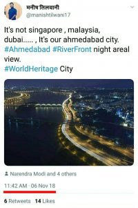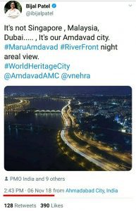 अहमदाबाद नगर निगम के लिए यह बड़ी शर्मिंदगी की बात है कि शहर की मेयर ने सियोल की एक तस्वीर साबरमती नदी के रूप में ट्वीट की है. 6 नवंबर को अहमदाबाद के महापौर बिजल पटेल ने एक तस्वीर को तथाकथित रूप से अहमदाबाद रिवरफ्रंट का बताते हुए एक संदेश ट्वीट किया, “यह सिंगापुर, मलेशिया, दुबई नहीं है. यह हमारा अहमदाबाद शहर है. #MaruAmdavad #RiverFront night areal view #WorldHeritageCity @AmdavadAMC @vnehra “- (अनुवादित)