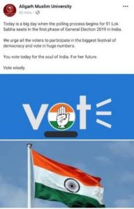 यह एक फेसबुक पोस्ट पर आधारित था, जिसके बारे में माना गया कि वह अलीगढ़ मुस्लिम विश्वविद्यालय के फेसबुक पेज का पोस्ट था। इस पोस्ट में सभी मतदाताओं से भारी संख्या में मतदान करके चुनाव में भाग लेने का आग्रह किया गया था। इसमें एक तस्वीर भी थी, जिसमें कांग्रेस पार्टी का निशान – खुला हाथ था। इस लेख को लिखने के समय, यह पोस्ट हटा दी गई थी।