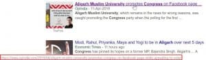 बाद में इसे “जब लोकसभा चुनाव के पहले चरण का मतदान चल रहा था, तब, ‘अलीगढ़ मुस्लिम विश्वविद्यालय’ नामक एक फेसबुक पेजको कांग्रेस पार्टी का प्रचार करते हुए पकड़ा गया था” द्वारा अपडेट किया गया। ऑल्ट न्यूज़ इस लेख के पिछले संस्करण तक नहीं पहुंच सका। हालाँकि, पहली कुछ पंक्तियाँ अभी भी गूगल परिणामों पर दिखाई देती हैं, जो सीधे सुझाती हैं कि “अलीगढ़ मुस्लिम विश्वविद्यालय” अपने फेसबुक पेज से भारतीय राष्ट्रीय कांग्रेस को बढ़ावा दे रहा था।