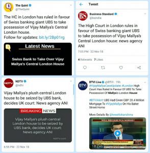 दूसरी तरफ, लोकप्रिय हिंदी प्रकाशन दैनिक भास्कर ने बताया कि यूके हाईकोर्ट ने यूबीएस को माल्या के लंदन वाले घर का कब्जा लेने की इजाजत दी है, हालांकि लेख में उल्लेख किया गया है कि इसकी सुनवाई 2019 में होगी। दिव्य भास्कर जो गुजराती समाचार पत्र है और डीएनए समूह का हिस्सा है, ने अपने पहले पृष्ठ पर बताया है कि 195 करोड़ रुपये का माल्या का लंदन वाला मकान जब्त कर लिया गया है। बीटीवीआई (BTVI) ने भी प्रसारित किया कि #लंदन हाईकोर्ट ने माल्या के लंदन वाले मकान का कब्जा लेने के लिए यूबीएस के पक्ष में फैसला सुनाया है। इंडिया टीवी ने भी बताया कि अदालत ने संपत्ति जब्त करने का आदेश दिया है।