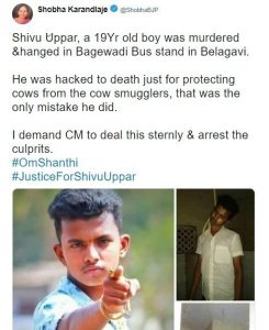 “शिवु उप्पर, बेलागवी के बगवाड़ी बस स्टैंड के पास 19 वर्षीय लड़के की हत्या फांसी के फंदे से लटका कर कर दी गई। गौ तस्करों से गायों की रक्षा करने के जुर्म में उसे मार दिया गया, बस यही उसकी गलती थी। मैं मुख्यमंत्री से इन गुनहगारों को सख्त से सख्त सज़ा देने की मांग करती हूँ।– (अनुवाद) ”