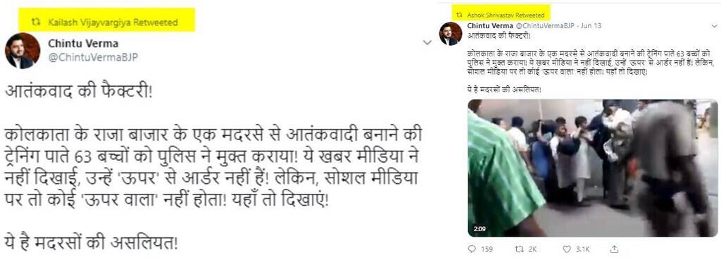 उन्होंने यह दावा किया है कि इन बच्चों को कोलकाता के मदरसे में आतंकवाद की ट्रैंनिंग के लिए भेजा जा रहा है। हालांकि पुलिस ने इन्हें बचा लिया है। वीडियो के साथ संदेश में,“आतंकवाद की फैक्टरी! कोलकाता के राजा बाजार के एक मदरसे से आतंकवादी बनाने की ट्रेनिंग पाते 63 बच्चों को पुलिस ने मुक्त कराया! ये खबर मीडिया ने नहीं दिखाई, उन्हें ‘ऊपर’ से आर्डर नहीं हैं! लेकिन, सोशल मीडिया पर तो कोई ‘ऊपर वाला’ नहीं होता! यहाँ तो दिखाएं! ये है मदरसों की असलियत!” लिखा गया है। इस ट्वीट को 1100 लोगों से ज्यादा लोगों ने रीट्वीट किया है, जिसमें कैलाश विजयवर्गीय और अशोक श्रीवास्तव जो की DD न्यूज़ के वरिष्ठ पत्रकार भी शामिल हैं।