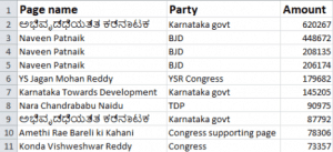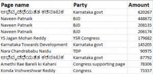 इसके विपरीत, सर्वाधिक खर्च करने वाला विपक्ष का पेज कर्नाटक सरकार की पहल थी जिसने कुल 7 लाख रुपये से कुछ अधिक खर्च किए, जबकि उड़ीसा के मुख्यमंत्री बीजेडी के नवीन पटनायक के आधिकारिक पेज ने कुल 8.5 लाख रुपये से कुछ अधिक का खर्चा किया था। नीचे दी गई तालिका में सबसे बड़े खर्चे वाले 10 विपक्ष के पेज हैं जिनका राजनीतिक विज्ञापनों पर संयुक्त रूप से 21 लाख रुपये से अधिक का खर्चा हुआ है।