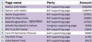 भाजपा-समर्थक 115 पेजों में से अकेले ‘Nation with NaMo’ ने 64 लाख रुपये से कुछ अधिक खर्च किया था।