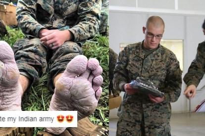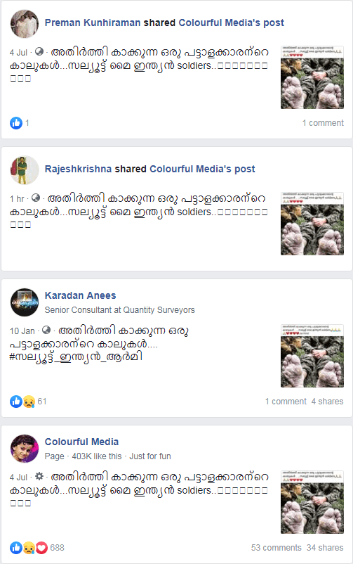 “അതിർത്തി കാക്കുന്ന ഒരു പട്ടാളക്കാരന്റെ കാലുകൾ ….സല്യൂട്ട് മൈ ഇന്ത്യൻ soldiers  (अनुवाद : सीमा की रखवाली करते एक सैनिक के पैर… मेरे भारतीय सैनिकों को सलाम।”)