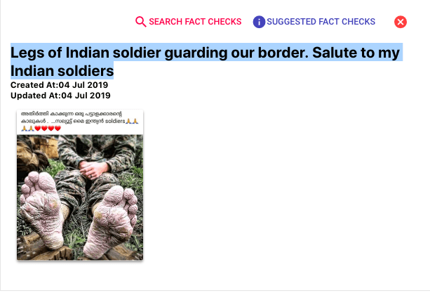 उपरोक्त संदेश, एक तस्वीर के साथ सोशल मीडिया में साझा किया गया है, जिसमें सैन्य वर्दी पहने हुए एक आदमी के पैर दिखाई दे रहे हैं। इस तस्वीर में दिखलाई गई पैर की स्थिति को “ट्रेंच फुट” के रूप में जाना जाता है जो पैरों के ठंडे पानी या कीचड़ में लंबे समय तक रहने के कारण हो जाता है।