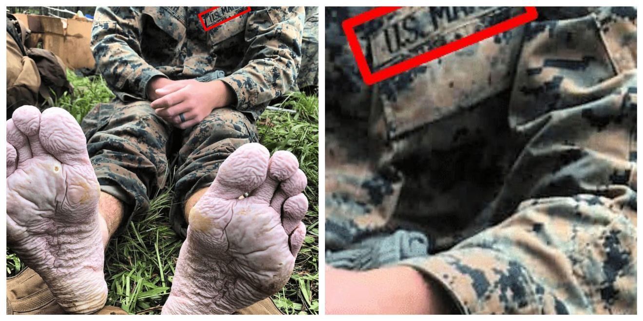इस तस्वीर में, बाईं तरफ की जेब के ऊपर लिखा शब्द “यूएस मरीन (US Marine)” स्पष्ट रूप से देखा जा सकता है।