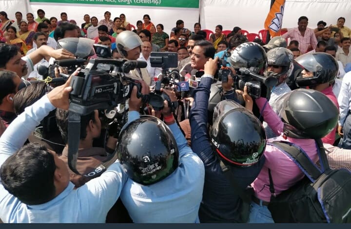 हेलमेट में पत्रकार: पांच दिन पहले रायपुर में भाजपा मुख्यालय के भीतर पत्रकारों की पिटाई के बाद से लगातार प्रदर्शन कर रहे पत्रकारों ने भाजपा नेताओं से बातचीत करते समय हेलमेट पहनना शुरु कर दिया है. @AmitShah @BJP4India @PMOIndia @bhupeshbaghel pic.twitter.com/SsnQ3mHRZ1