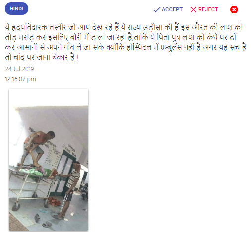 वायरल संदेश में लिखा है –“ये ह्रदयविदारक तस्वीर जो आप देख रहे हैं ये राज्य उड़ीसा की हैं इस औरत की लाश को तोड़ मरोड़ कर इसलिए बोरी में डाला जा रहा है ताकि ये पिता पुत्र लाश को कंधे पर ढो कर आसानी से अपने गाँव ले जा सके क्योंकि होस्पिटल में एम्बुलेंस नहीं है अगर यह सच है तो चांद पर जाना बेकार है”।