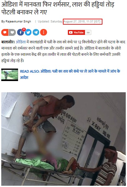 इस घटना को मुख्यधारा के मीडिया संगठन ने भी प्रकाशित किया था, जिसमें द इंडियन एक्सप्रेस, इंडिया टीवी, इंडिया टुडे, NDTV और हिंदुस्तान टाइम्स भी शामिल है। ओडिशा के सोरो में ट्रेन दुर्घटना में एक बुज़ुर्ग महिला की मौत हो गई थी। इस क्षेत्र में एक भी अस्पताल नहीं है सिवाय एक स्वास्थय केंद्र के, जहां पर महिला के शरीर को लाया गया था। एम्बुलैंस की अनुपस्थति में और ऑटो-रिक्शा के 3000 रुपये तक के किराए की वज़ह से दो कर्मचारियों ने महिला के शरीर को पास के रेलवे स्टेशन तक आसानी से पहुंचाने के लिए पैरों के हिस्से को तोड़ दिया। पोस्टमार्टम के लिए इसे बालासोर से 30 किमी दूर ले जाने की आवश्यकता थी।