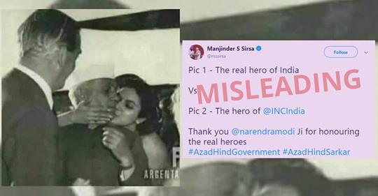 एनडीए से संबद्ध शिरोमणि अकाली दल (SAD) के दिल्ली के विधायक मंजिंदर एस सिरसा ने पूर्व प्रधानमंत्री जवाहरलाल नेहरू को पीछे से लिपटकर उनके गाल को चूमती एक महिला की तस्वीर को इस कैप्शन के साथ ट्वीटकिया – “भारतीय राष्ट्रीय कांग्रेस के नायक”। नेहरू की इस तस्वीर के साथ उन्होंने नेताजी सुभाषचंद्र बोस की ई-पेपर क्लिप-जैसी तस्वीर पोस्ट की है और प्रशंसा में उन्हें “भारत का असली नायक” कहां है।