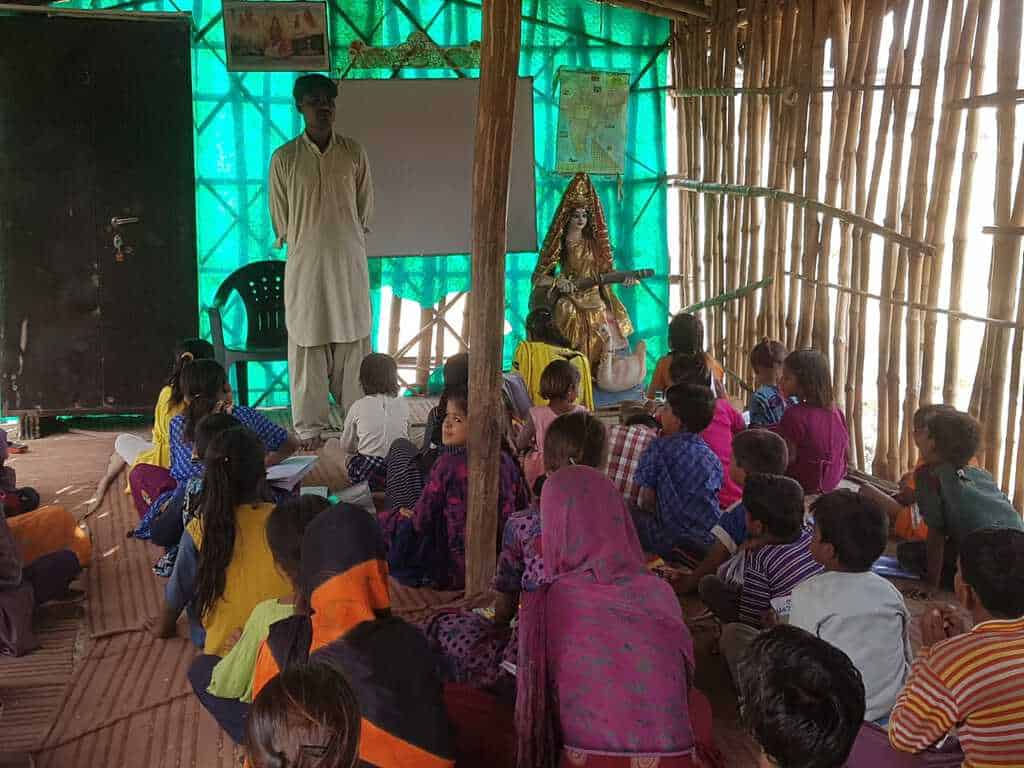 इस बस्ती में दाखिल होते ही सामने झोपड़ी के आकार की एक पाठशाला है. जिसमें बस्ती के बच्चे ट्यूशन पढ़ते हैं. इन बच्चों को पढ़ाने के लिए 1 शिक्षक हैं — विक्रम जो एक साल पहले पाकिस्तान से भारत आए हैं, और खुद इसी बस्ती के निवासी हैं. वे लगभग 110 बच्चों को 2 शिफ्टों में अकेले पढ़ाते हैं.