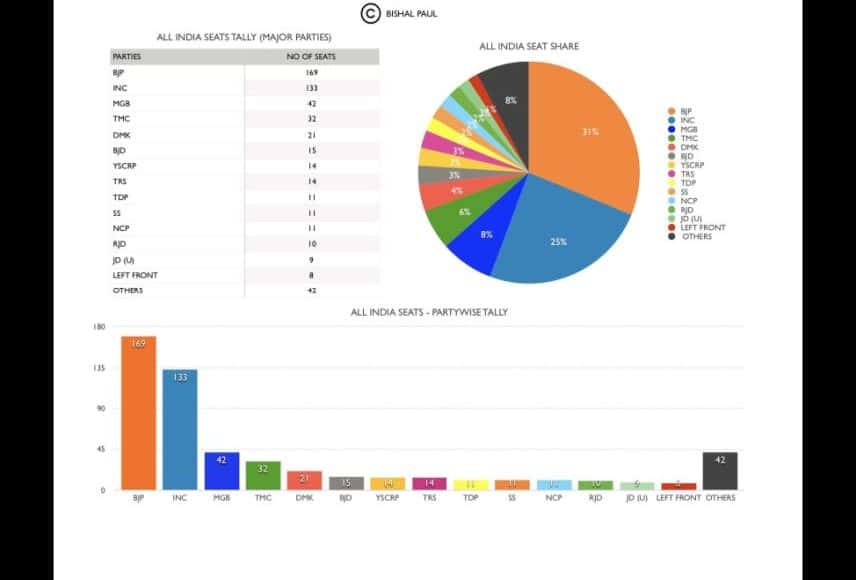 बिशाल पॉल के विश्लेषण के अनुसार, भाजपा केवल 169 सीटों पर जीत हासिल कर पाएगी. जबकि राष्ट्रीय जनतांत्रिक गठबंधन (एनडीए) कुल 200 सीटों पर अपना कब्जा जमाएगी. वहीं, यूपीए 197 सीटों पर जीत हासिल करेगी, जबकि कांग्रेस 145 सीट अपने नाम करेगी. जो 2014 में जीती 101 सीटों से 44 सीटें अधिक है .