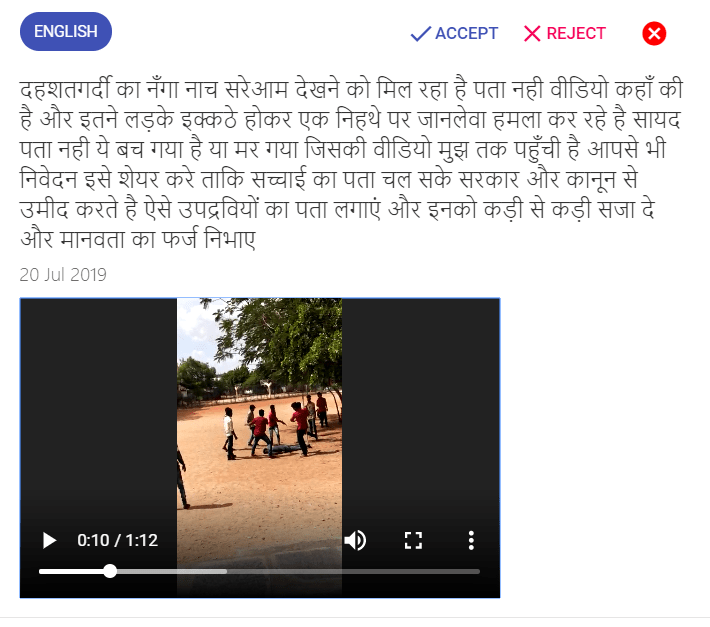 सोशल मीडिया में उपरोक्त संदेश के साथ एक वीडियो को व्यापक रूप से साझा किया गया है, जिसमें ज़मीन पर गिरे हुए एक व्यक्ति को कुछ लोग बड़ी बेरहमी के साथ पिटाई कर रहे है। ट्विटर पर @NehalAhAnsari6 नामक एक उपयोगकर्ता ने इस वीडियो को साझा किया है। इस लेख को लिखते समय ही वीडियो को करीब 8500 बार देखा जा चूका है।