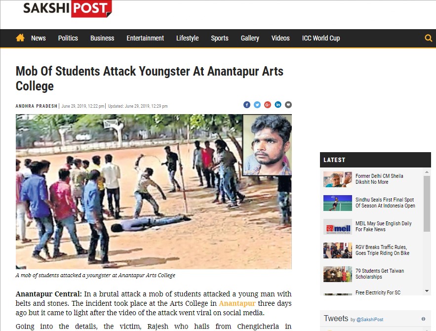 इस वीडियो को इनविड के ज़रिये की-फ्रेम में तोड़ कर, इन की-फ्रेम को गूगल पर रिवर्स इमेज सर्च करने पर हमें इस वीडियो से संबधित कुछ लेख मिले, जिसके मुताबिक इस घटना को आंध्रप्रदेश के अनंतपुर आर्ट्स कॉलेज का बताया गया था। आगे संबधित कीवर्ड्स से गूगल पर सर्च करने से हमें इस घटना से संबधित स्थानीय मीडिया संगठन द्वारा प्रकाशित कुछ लेख मिले। साक्षी पोस्टद्वारा प्रकाशित लेख के मुताबिक, पीड़ित व्यक्ति का नाम शिवाय (Shivayya) है। शिवाय अपने दोस्त राजेश से मिलने के लिए अक्सर अनंतपुरा आर्ट्स कॉलेज में आया करता था। इस दौरान एक लड़की को वह पसंद करने लगा था। इसी बात को लेकर भरत नाम के एक युवक से उसका विवाद हो गया था, जिसके बाद भरत ने शिवाय को कॉलेज में 25 जून, 2019 को मिलने के लिए बुलाया और अपने अन्य 25 साथी के साथ मिल कर उसकी पिटाई की। पुलिस इस विवाद के बारे में आगे की जांच कर रही है और इनमें से कुछ आरोपियों ने पहले ही पुलिस के सामने आत्म समर्पण कर दिया है। फ़िलहाल शिवाय के स्वास्थ्य में सुधार देखने को मिल रहा है।