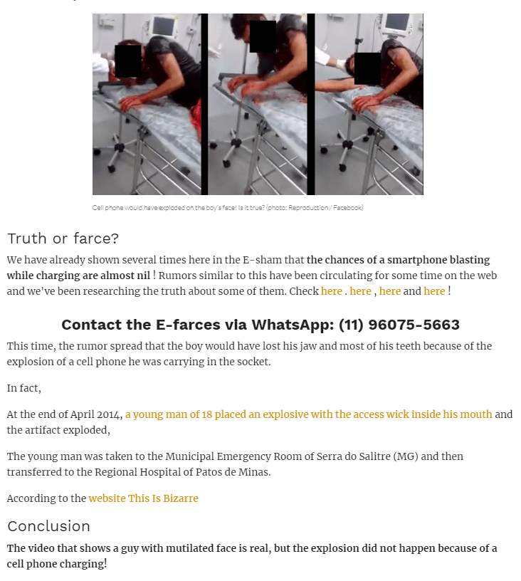 3. ऑल्ट न्यूज़ ने वायरल वीडियो को इनविड के जरिए कई की-फ्रेम में तोड़कर व्यक्ति के खून से जबड़े वाली तस्वीर को रिवर्स सर्च किया। 2016 में इस वीडियो की ब्राज़ील की एक तथ्य जांच वेबसाइट E-Farsas द्वारा भी पड़ताल की गई थी। E-Farsas ने दावा किया था कि यह व्यक्ति दरअसल मुँह में विस्फोटक रख कर आत्महत्या करने का प्रयास कर रहा था। वेबसाइट के मुताबिक, यह घटना 2014 को हुई थी। ऑल्ट न्यूज़ इसकी स्वतंत्र रूप से पुष्टि नहीं कर सकता है क्योंकि E-Farsas द्वारा दिए गए स्त्रोत अब उपलब्ध नहीं है।