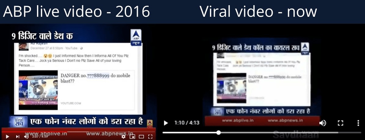 4. हमने पाया कि वीडियो में उपयोग की गई ABP लाइव क्लिप दिसंबर 2016 के वायरल सच नाम के कार्यक्रम के प्रसारण का हिस्सा है, जिसमें समाचार चैनल “वायरस” पर रिपोर्ट नहीं कर रहा था बल्कि वायरल दावे की पड़ताल कर रहा था। यह पूरा प्रसारण 5 मिनट का है और ABP लाइव के कार्यक्रम में तथ्य जांच की शुरुआत 2:40 मिनिट से होती है। वायरल वीडियो में ABP लाइव के सिर्फ वायरल मैसेज के दावे को ही लिया गया है जिसमें लोगों से अपील किया जा रहा है कि ‘777888999’ नंबर से आने वाले कॉल को ना उठाए। इससे सोशल मीडिया यूज़र्स को यह विश्वास दिलाने का प्रयास किया गया है कि यह “जानलेवा नंबर” सच है क्योंकि इसे मीडिया द्वारा प्रसारित किया गया है।