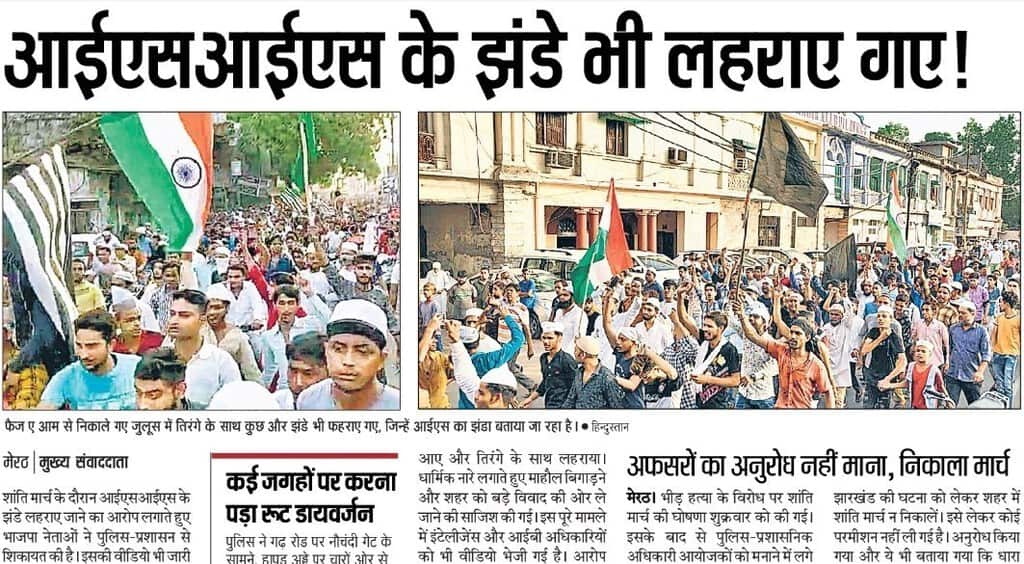 30 जून को, हाल ही में झारखंड में तबरेज़ अंसारी के साथ हुई लिंचिंग की घटना के विरुद्ध में उत्तर प्रदेश के मेरठ में एक प्रदर्शन रैली निकाली गई। उसके अगले दिन यानि की 1 जुलाई को, हिंदी प्रकाशन हिंदुस्तान, जो कि हिंदुस्तान टाइम्स समूह से संबंधित है, अपने मेरठ संस्करण में एक लेख प्रकाशित किया था। इस लेख का शीर्षक,“आईएसआईएस के झंडे भी लहराए गए !” था। इस लेख के साथ दो तस्वीरें प्रकाशित की गई थी। पहली तस्वीर में, काले और सफ़ेद रंग के पट्टी वाला झंडा दिखाई दे रहा है। दूसरी तस्वीर में, काले रंग के झंडो को देखा जा सकता है।