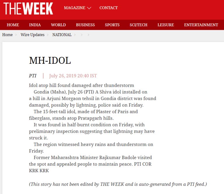 गूगल पर संबधित की-वर्ड्स से सर्च करने पर हमें द वीक द्वारा प्रकाशित PTI का एक लेख मिला। लेख के अनुसार, पुलिस की प्रारंभिक जांच से पता चलता है कि गोंदिया जिले के मोरगांव के अर्जुनी तहसील में एक पहाड़ी पर स्थापित शिव की मूर्ति संभवत बिजली गिरने के कारण खंडित हुई है। इससे यह पता लगता है कि मूर्ति के ऊपर के हिस्से में जलने का निशान है, लेकिन नीचले हिस्से में नहीं है। यह समझ से बाहर है कि लोग इसके नीचले हिस्से के बजाय ऊपरी भाग को जलाने के लिए 15 फीट की विशाल मूर्ति पर चढ़ गए।
