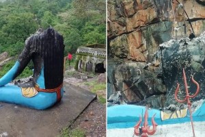 शिव की मूर्ति, जो शायद बिजली के कारण खंडित हुई है, इसकी तस्वीरों को सोशल मीडिया उपयोगकर्ताओ ने मुस्लिम समुदाय द्वारा तोड़े जाने के झूठे दावे से साझा किया है।