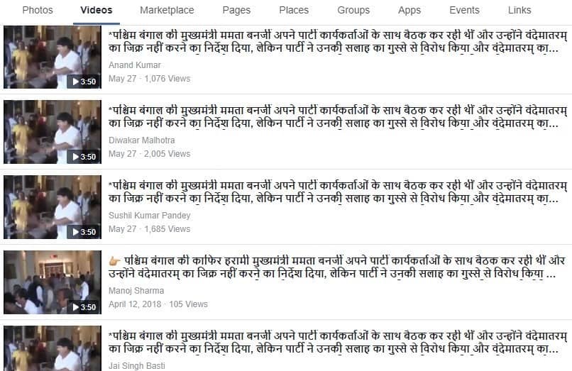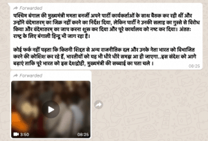 इस संदेश के साथ सोशल मीडिया पर पश्चिम बंगाल की मुख्यमंत्री ममता बनर्जी का एक वीडियो साझा किया गया है। इस वीडियो में ममता बनर्जी को उनके आसपास खड़े लोगों पर चिल्लाते हुए देखा जा सकता है। उसके बाद के दृश्यों में लोगों को उस जगह पर तोड़फोड़ करते हुए देखा जा सकता है। इस वीडियो में यह दावा किया गया है कि ममता बनर्जी ने पार्टी कार्यकर्त्ताओं की एक मीटिंग बुलाई थी, जहां वन्दे मातरम् बोलने को लेकर हंगामा हुआ और पार्टी कार्यकर्ताओं ने अपने सुप्रीमो के बचाव में पार्टी कार्यालय में तोड़फोड़ की और वन्दे मातरम् के नारे लगाए।