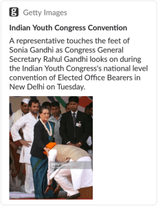 एक आसान सा गूगल रिवर्स इमेज सर्च करने से, पता चलता है कि यह तस्वीर 2011 की है और श्रीमती गांधी के पैर छूने वाला व्यक्ति कांग्रेस का ही एक प्रतिनिधि है। गेट्टी इमेज में इस तस्वीर को एक कैप्शन के साथ पोस्ट किया गया है – “मंगलवार 29 मई, 2011 को नई दिल्ली में भारतीय युवा कांग्रेस के निर्वाचित पदाधिकारियों के राष्ट्रीय स्तर के सम्मेलन के दौरान सोनिया गांधी के पैर छूते एक प्रतिनिधि को देखते कांग्रेस महासचिव राहुल गांधी।”
