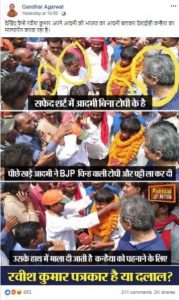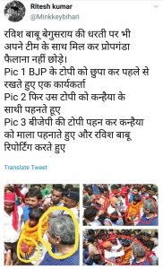 ट्विटर यूज़र, रितेश कुमार ने तस्वीरों का एक कोलाज पोस्ट किया, जिसमें एक रोड शो में, पत्रकार रवीश कुमार और सीपीआई के बेगूसराय उम्मीदवार कन्हैया कुमार हैं। तस्वीरों के इस संग्रह के साथ पोस्ट किए गए संदेश में एक दावा करने की कोशिश की गई है, जिसके अनुसार, रवीश कुमार की मौजूदगी में कन्हैया को माला पहनाने के लिए एक व्यक्ति को सेट किया गया। नीचे दिए गए ट्वीट में तीन तस्वीरें हैं, जिनके, उन घटनाओं का, क्रमानुसार प्रतिनिधित्व करने का दावा किया गया है। इस क्रम के अनुसार, एक कार्यकर्ता [स्वयंसेवक] भाजपा की टोपी छिपा रहा था, जिसे बाद में कुमार के सामने खड़े एक व्यक्ति को दिया गया था। इसमें आगे दावा किया गया है कि उस व्यक्ति ने कन्हैया कुमार को माला पहनाने से ठीक पहले भाजपा की टोपी पहनी। पूरे प्रकरण को “प्रचार” कहते हुए, इस पोस्ट में पत्रकार की विश्वसनीयता को धूमिल करने का प्रयास किया गया।