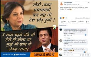 3 मई को एक फ़ेसबुक पेज Wise Indian Tongue – WIT ने शबाना आज़मी की तस्वीर के साथ कथित तौर पर एक बयान यह दिखाते हुए पोस्ट किया कि उन्होंने ऐसा कहा है, “इस बार भी अगर नरेंद्र मोदी जीत कर प्रधानमंत्री बन गए तो मैं देश छोड़ दूंगी !!! -शबाना आजमी !!” इस पोस्ट को 700 से ज़्यादा बार शेयर किया गया है।