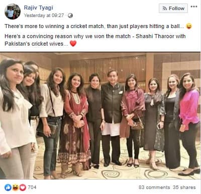 सोशल मीडिया में कांग्रेस नेता शशि थरूर के साथ कुछ महिलाओं की एक तस्वीर को “पाकिस्तानी क्रिकेटरों की पत्नियों के साथ केरल के सांसद” के रूप में साझा की जा रही है। इस तस्वीर को साझा करने में एक फेसबुक उपयोगकर्ता राजीव त्यागी भी शामिल थे। उन्होंने तस्वीर के साथ लिखा है, “खिलाड़ियों को गेंद को मारने के अलावा क्रिकेट मैच जीतने के लिए और भी कई चीजें जरुरी होती हैं… यहां पर एक ठोस कारण है कि हमने मैच क्यों जीता — पाकिस्तान की क्रिकेट पत्नियों के साथ शशि थरूर- (अनुवाद)”।