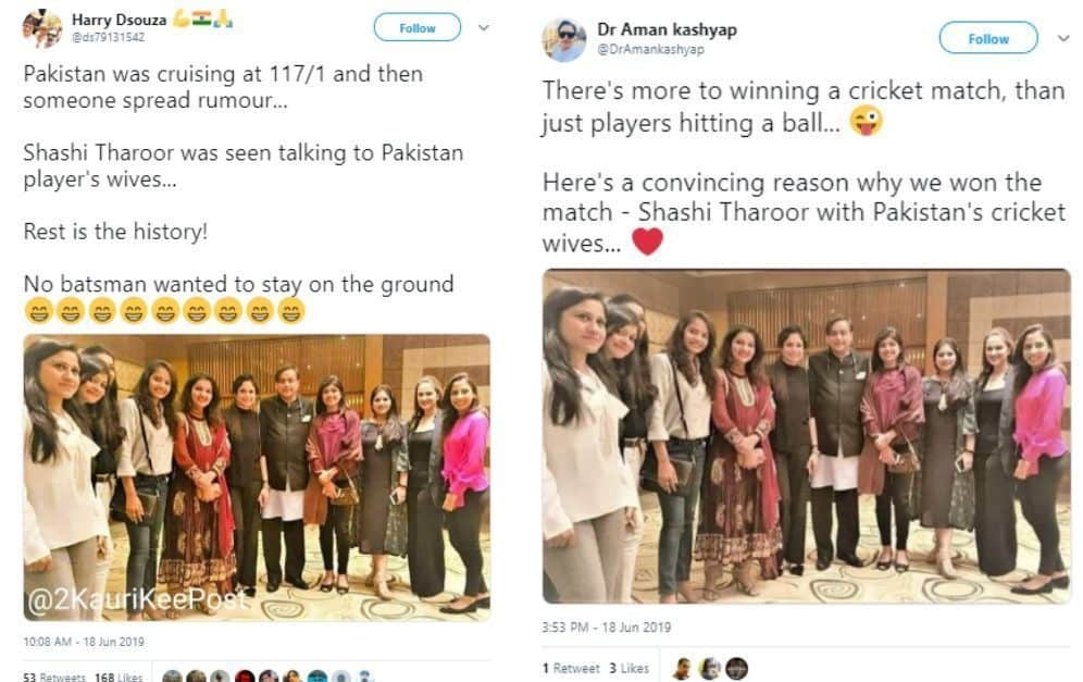 कई लोगों ने इस तस्वीर को हिंदी संदेश के साथ भी प्रसारित किया है। उनमें से सभी ने यह दावा नहीं किया कि थरूर ने पाकिस्तानी क्रिकेट खिलाड़ियों की पत्नियों के साथ फोटो खिंचवाई, बल्कि ज्यादातर लोगों ने तस्वीर के साथ गंदे दावे किये है –“उन्होंने अपनी खुद की टीम 11 बनाई है” और “वह अपने खुद के विश्व कप पर हैं”।