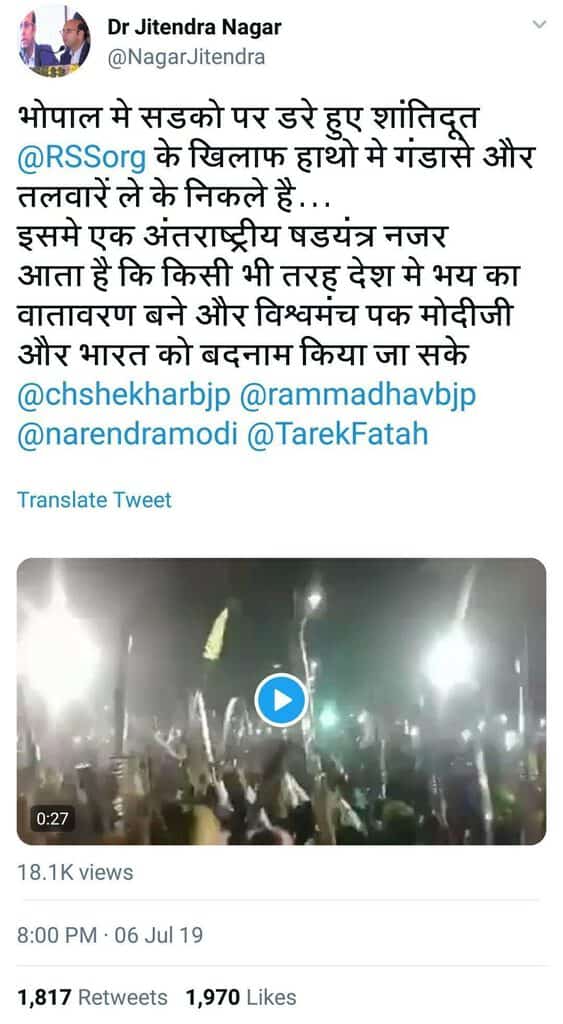 इसी वीडियो को ट्विटर पर डॉ.जीतेन्द्र नागर (@NagarJitendra) ने संदेश,“भोपाल मे सडको पर डरे हुए शांतिदूत @RSSorg के खिलाफ हाथो मे गंडासे और तलवारें ले के निकले है… इसमे एक अंतराष्ट्रीय षडयंत्र नजर आता है कि किसी भी तरह देश मे भय का वातावरण बने और विश्वमंच पर मोदीजी और भारत को बदनाम किया जा सके। MP मे कोंग्रेस की सरकार है तो साजिश ही हो सकती है” के साथ साझा किया है।