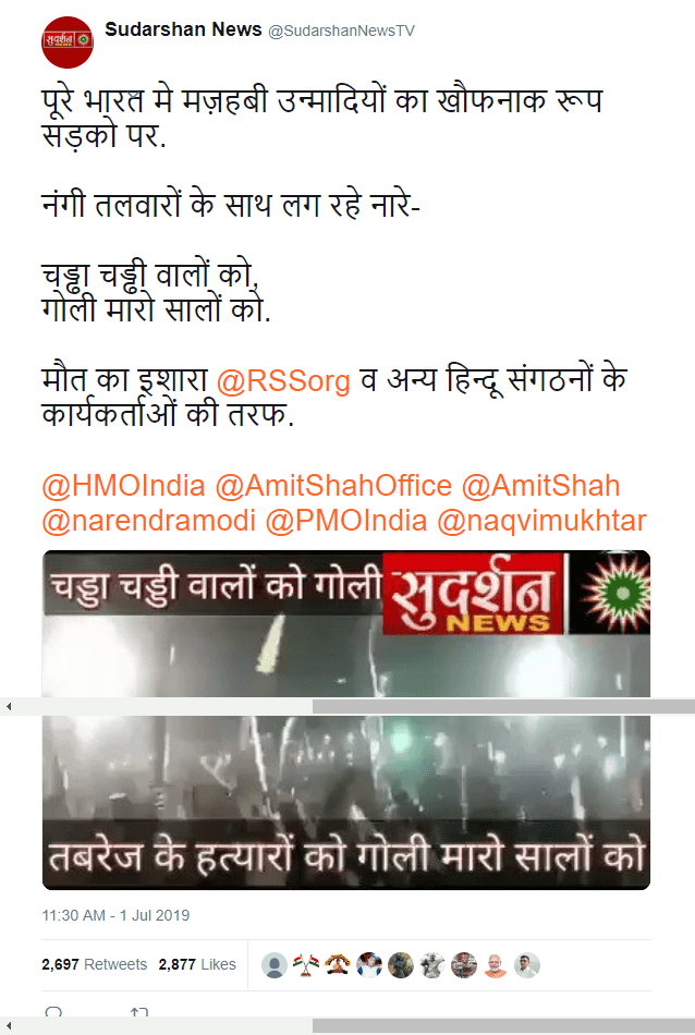 सुदर्शन न्यूज़ द्वारा एक वीडियो को उपरोक्त दावे के साथ साझा किया गया है, जिसमें लोगों को कथित तौर पर,“अल्लाह -ओ -अकबर, तबरेज़ के हत्यारों को मार डालो, आरएसएस मुर्दाबाद, हाफ पैंट वालो को गोली मारो, तबरेज़ का खून क्रांति लाएगा”का नारा लगाते हुए सुना जा सकता है।