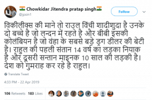 यह तस्वीर इस साल की शुरुआत में बदले हुए संदेश के साथ वायरल हुई थी जिसमें दावा किया गया था कि यह महिला पोर्न अभिनेत्री थी। आम चुनावों की शुरुआत के बाद से, राहुल गांधी से संबंधित गलत जानकारी सोशल मीडिया में लगातार तैर रही है। गांधी अपने नामांकन पत्र सौंपते समय ‘अशिष्ट‘ थे। गलत सूचना के एक अन्य मामले में दावा किया गया कि कांग्रेस के पोस्टर पर गांधी का नाम गलत लिखा गया था। कांग्रेस अध्यक्ष के नाम से एक नकली अखबार की क्लिपिंग को भी शेयर किया गया था।