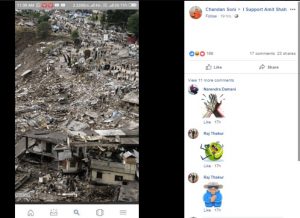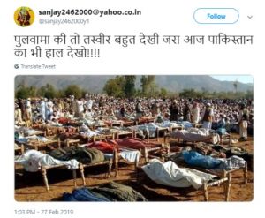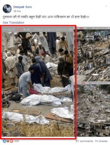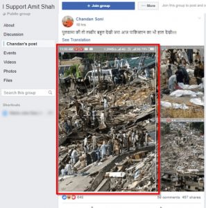 यह तस्वीर, फेसबुक ग्रुप ‘आई सपोर्ट अमित शाह’ समेत, कई यूजर्स द्वारा शेयर की गई है। यह अक्टूबर 2005 के कश्मीर के भूकंप को दर्शाती है। यह तस्वीर पाकिस्तान के बालाकोट शहर में ली गई थी। BBC रिपोर्ट के अनुसार, “इस भूकंप से पाकिस्तान के उत्तरी क्षेत्र, अफगानिस्तान और भारत प्रभावित हुए थे। अनुमानित रूप से 75,000 लोग मारे गए, अधिकांशतः पाकिस्तान शासित कश्मीर में।”