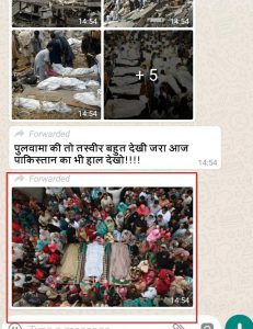 यह तस्वीर, दूसरी तस्वीरों की तरह, व्हाट्सएप्प पर व्यापक रूप से प्रसारित है। मगर यह भारत और पाकिस्तान के बीच के हालिया टकराव को नहीं दर्शाती है। यह तस्वीर 3 नवंबर 2014 को ली गई थी, जब भारत-पाक सीमा पर एक पाकिस्तानी तालिबानी ग्रुप ने बमबारी की थी। इसकी मूल तस्वीर हमें अल जज़ीरा की एक रिपोर्ट में मिली।