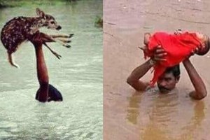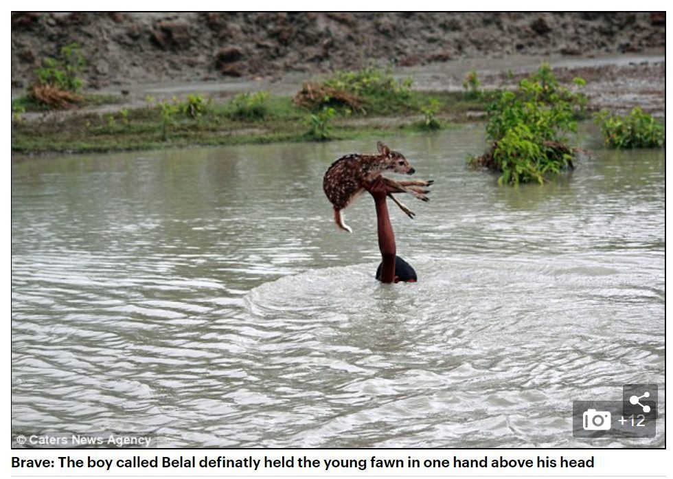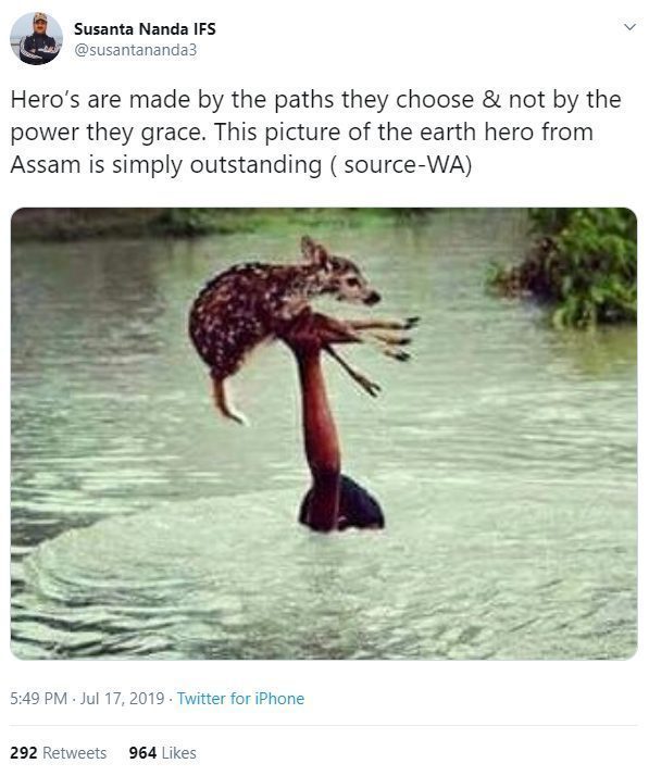 सोशल मीडिया में बाढ़ के पानी से हिरण को बचाने वाले एक किशोर की तस्वीर को साझा किया गया है। सुशांत नंदा नामक एक उपयोगकर्ता ने इस संदेश के साथ एक तस्वीर को ट्वीट किया,“हीरो उन रास्तों से बनते है जिसे वह खुद पसंद करते है ना कि उस शक्ति से जिसे वे पाते है। यह पृथ्वी के उस हीरो की असम की अद्भुत तस्वीर है”-(अनुवाद)। इस साल असम में भयंकर बाढ़आई है, जिससे डेढ़ लाख लोग राहत शिविरों में शरण लेने के लिए मजबूर हुए और कम से कम 30 लोगों की जान चली गयी है।