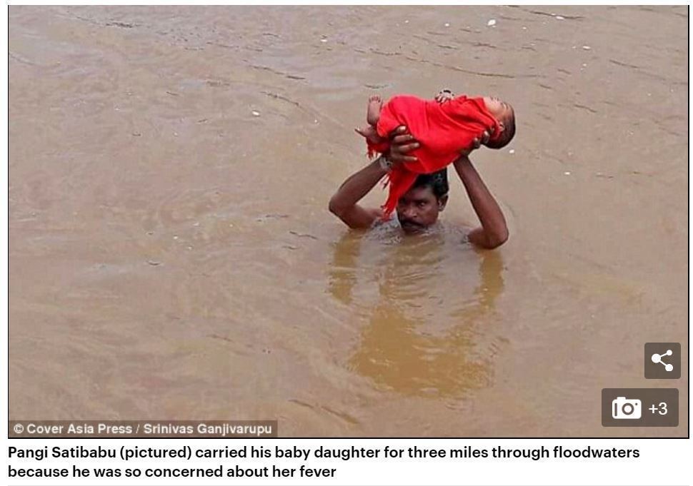 यह तस्वीर 2016 में आंध्र प्रदेश में आयी बाढ़ के दौरान ली गई थी, जहां पर एक चिंतातुर पिता अपनी बीमार बेटी को गहरे पानी में सिर पर उठाकर चल रहा था ताकि वो अपनी बेटी को नज़दीक के किसी अस्पताल में ले जा सके। 29 सितंबर 2016 को डेली मेल के अनुसार,“आंध्र प्रदेश के कुडुमुसारे गांव के 30 वर्षीय किसान पांगी सतीबाबू ने अपनी छह महीने की बेटी को तीन मील तक अपने सिर पर उठाकर निकटतम स्वास्थ्य केंद्र में पहुंचाया”-(अनुवाद)।