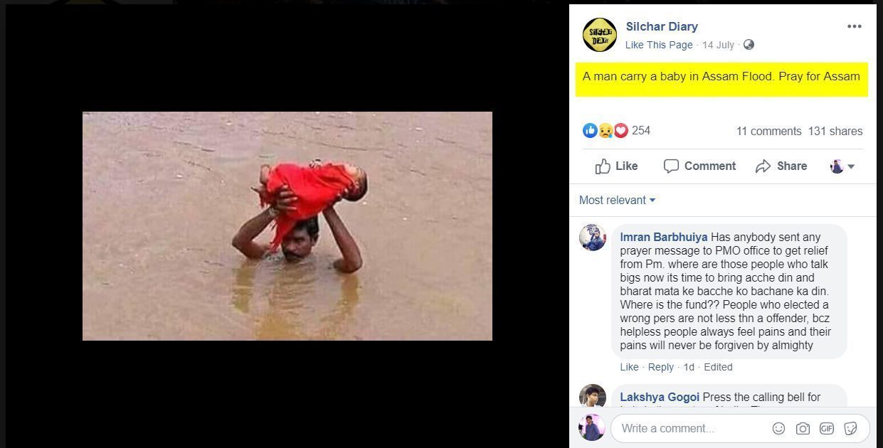 एक अन्य तस्वीर जिसमें एक व्यक्ति पानी में पूरा डूबा हुआ है और अपने कंधो पर एक बच्ची को लेकर जा रहा है, इस तस्वीर को भी असम में हाल ही में आई बाढ़ से संबंधित बताकर साझा किया गया है।