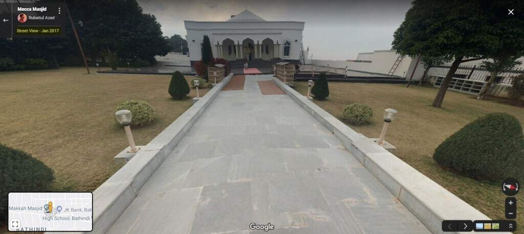 इस दावे के आधार पर, हमने जम्मू में मक्का मस्जिद की खोज कर, समानताएं देखने का प्रयास किया। मक्का मस्जिद जम्मू के बठिंडी क्षेत्र में है। गूगल मैप का प्रयोग करके, हमने मस्जिद को ‘स्ट्रीट व्यू’ की मदद से देखा, जिसकी तस्वीर आप नीचे देख सकते हैं।