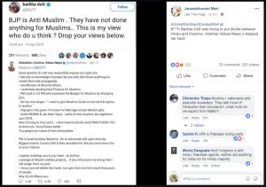 वरिष्ठ पत्रकार बरखा दत्त और अल्पसंख्यक मामलों के केंद्रीय मंत्री मुख्तार अब्बास नकवी के बीच एक ट्विटर कमेंट्स का स्क्रीनशॉट सोशल मीडिया पर वायरल है। स्क्रीनशॉट में शुरू में दत्त का एक कथित ट्वीट दिखाया गया है जिसमें वह कहती हैं, “भाजपा मुस्लिम विरोधी है। उन्होंने मुसलमानों के लिए कुछ नहीं किया है। यह मेरा विचार है ,आप में से कौन क्या सोचते हैं? नीचे अपने विचार रखें।”-(अनुवाद)इसके बाद नकवी का कथित जवाब दिखता है जिसमें वे भाजपा द्वारा मुस्लिमों के पक्ष में किए गए प्रयासों को बताते हैं।