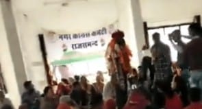 अगर कोई वीडियो को ध्यान से देखे तो मंच पर लगे बैनर पर — ‘नगर कांग्रेस कमिटी, राजसमंद’ लिखा है।