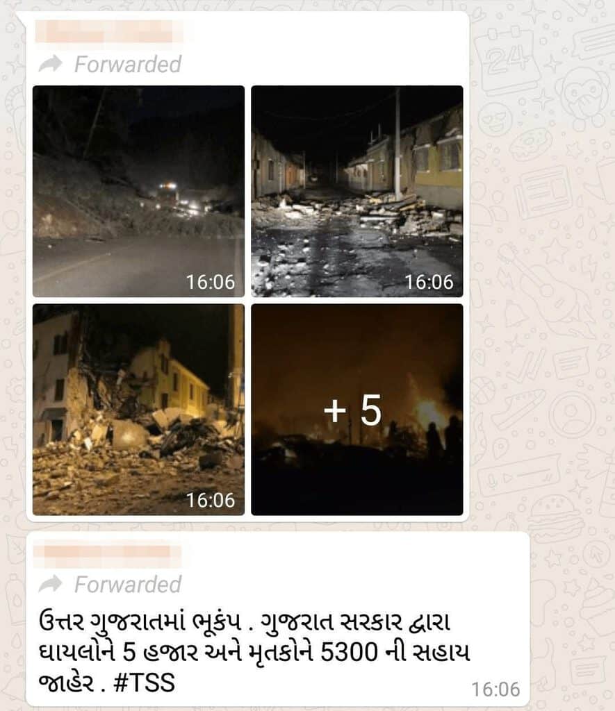 पूरी दुनियाभर में आए भूकंप से जुड़ी हुई पुरानी तस्वीरों को हाल ही में उत्तर गुजरात में आये भूकंप से संबधित बताकर व्हाट्सअप पर साझा किया जा रहा है। इसी तरह का एक मामला बालाकोट में हवाई हमले के बाद भी देखा गया था, जब पाकिस्तान में भारतीय वायुसेना के हमले के बाद हुए विनाश के रूप में गलत तरीके से साझा किया गया था।