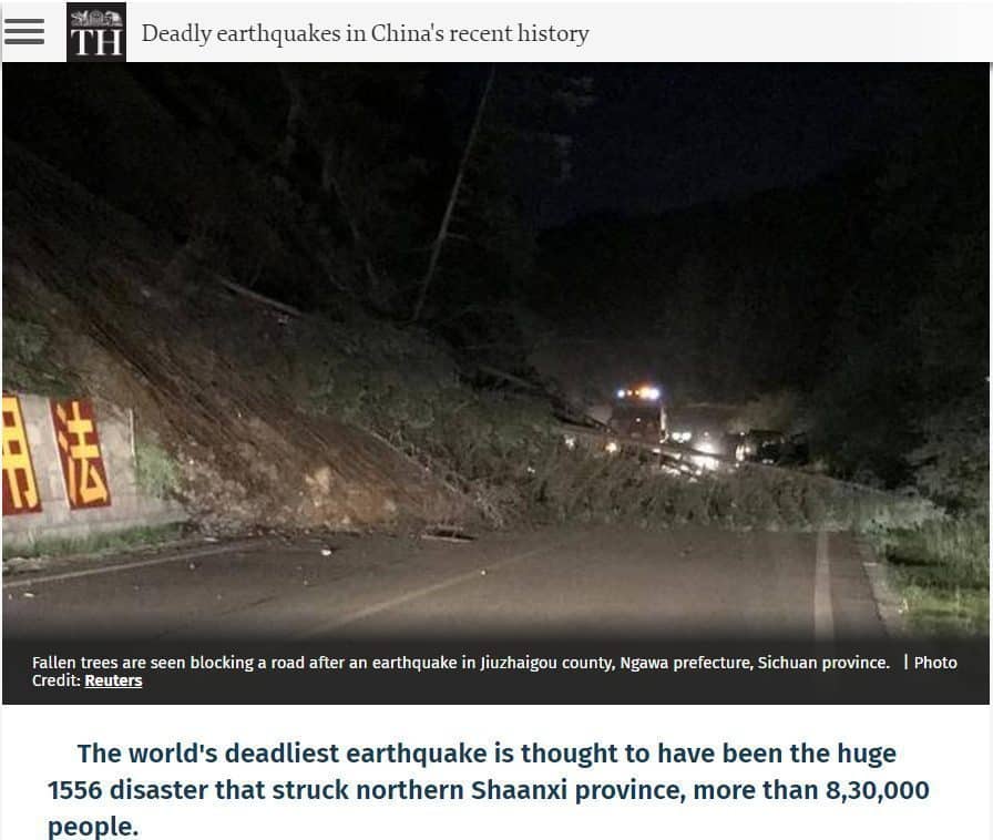 छठी तस्वीररॉयटर की है, जिसे द हिंदू द्वारा एक रिपोर्ट में प्रकाशित किया गया था। यह रिपोर्ट अगस्त 2017 में चीन में आए दक्षिण-पश्चिमी पर्वतीय सिचुआन के एक घातक भूकंप की है। इस तस्वीर के साथ दिए हुए कैप्शन के मुताबिक,“जिउजैगौ काउंटी, नगावा प्रान्त, सिचुआन में आए भूकंप के बाद नीचे गिरे हुए पेड़ की वजह से एक सड़क अवरोधित हुई है”।- (अनुवाद)