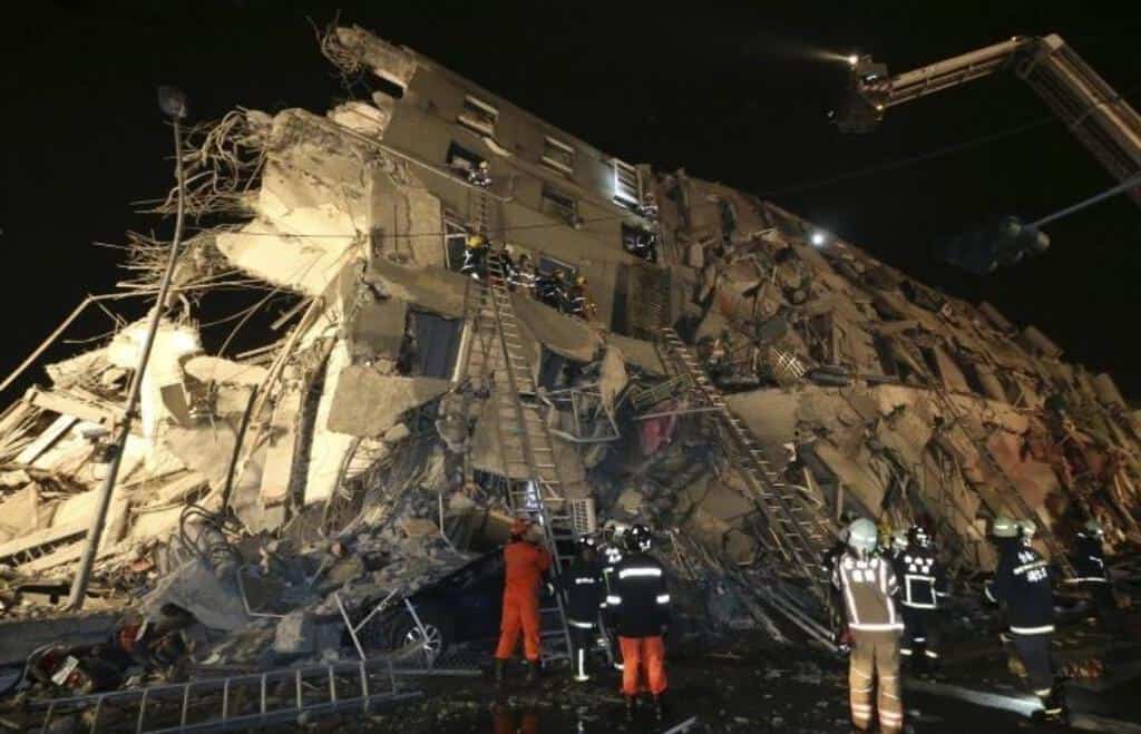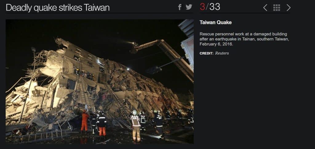 “6 फरवरी, 2016 को दक्षिणी ताइवान में भूकंप के बाद एक क्षतिग्रस्त ईमारत में बचाव कर्मी कार्य करते हुए”-(अनुवाद) इस कैप्शन को रॉयटर्स की तस्वीर के साथ CBS News के एक लेख में तीन साल पहले प्रकाशित किया गया था, जिसे अभी उत्तर गुजरात में आये भूकंप से संबधित बताकर साझा किया गया है।
