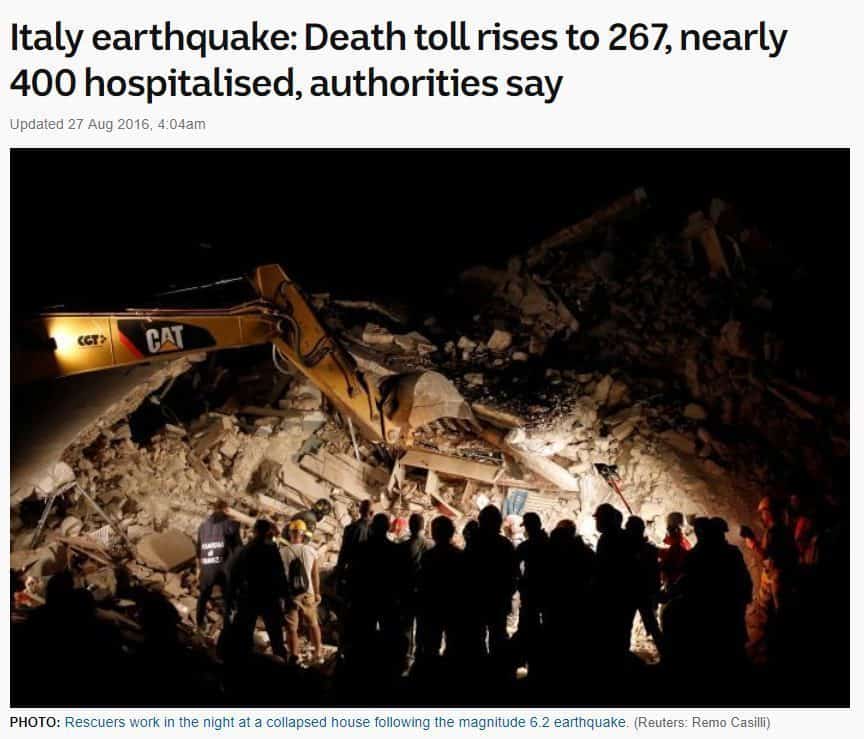 यह तस्वीर अगस्त 2016 को मध्य इटली में आये भूकंप से संदर्भित है। ABC के लेख के मुताबिक, 27 अगस्त, 2016 तक इस घटना में 267 में 267 लोगों की मौत हो गयी थी।