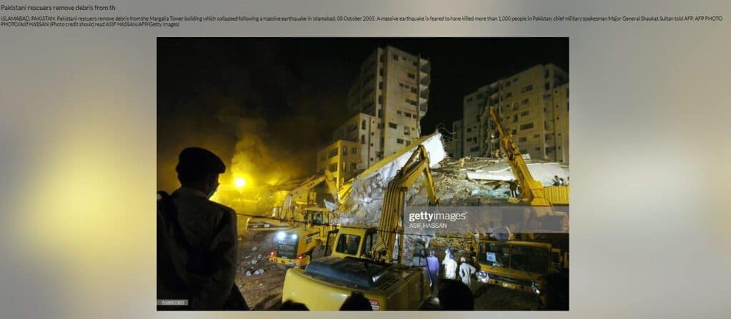 इस तस्वीर में मार्गला टावर्स को दिखाया गया है, जो इस्लामाबाद, पाकिस्तान में 2005 में एक भूकंप के दौरान ढह गई थी। ऑल्ट न्यूज़ ने इस तस्वीर को गेट्टी इमेज पर पाया, जिसे आसिफ़ हसन नामक फॉटोग्राफर ने लिया था।
