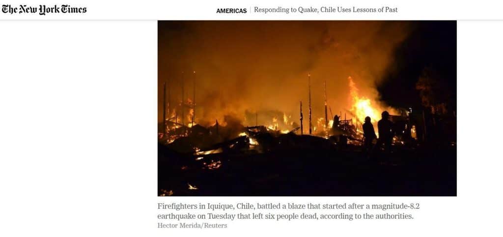 एक लेख के शीर्षक, “भूकपं के बाद, चिली अपने पुराने हथकंडो का उपयोग करता हुआ”– (अनुवाद) के साथ यह तस्वीर 2 अप्रैल, 2014 को द न्यू यॉर्क टाइम्स में प्रकाशित हुई थी। तस्वीर के साथ दिए गए कैप्शन के मुताबिक, आइकिक, चिली में 8.2 तीव्रता के भूकंप के बाद लगी आग को बुझाने की कोशिश में अग्निशामक का इस्तेमाल किया गया था।