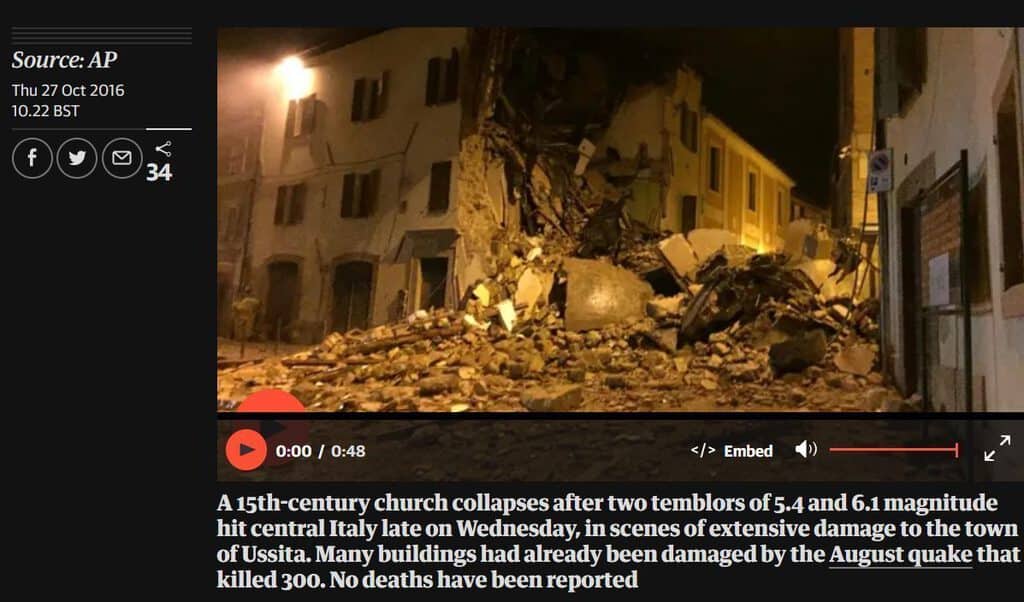 चौथी तस्वीर 15वीं सदी के चर्च से जुड़ी हुई है जो 26 अक्टूबर 2016 को मध्य इटली में आये 5.4 और 6.1 तीव्रता वाले भूकंप के बाद ढह गया था। इस संबंध में द गार्डियन की एक वीडियो रिपोर्ट के स्क्रीनशॉट को नीचे पोस्ट किया गया है।