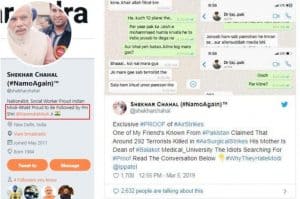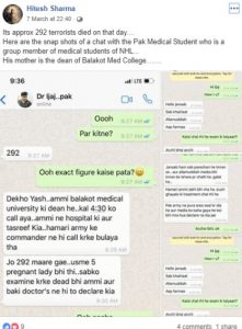 ट्विटर यूजर शेखर चहल ने एक कथित पाकिस्तानी, जो उनके दावे के अनुसार बालाकोट में रहते हैं, के साथ व्हाट्सएप्प चैट शेयर किया था। उस ‘दोस्त’ ने सुझाया था कि भारतीय वायुसेना के हवाई हमले में जैश-ए-मोहम्मद के 292 आतंकवादी मारे गए। चहल को प्रधानमंत्री नरेंद्र मोदी ट्विटर पर फॉलो करते हैं।